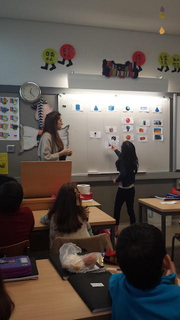 As crianças, individualmente, dirigiram-se ao quadro e identificaram se era uma figura ou sólido geométrico, nome, n.º de lados, n.º de vértices, superfícies planas e não planas... no final da identificação, colaram as imagens nos respetivos conjuntos.